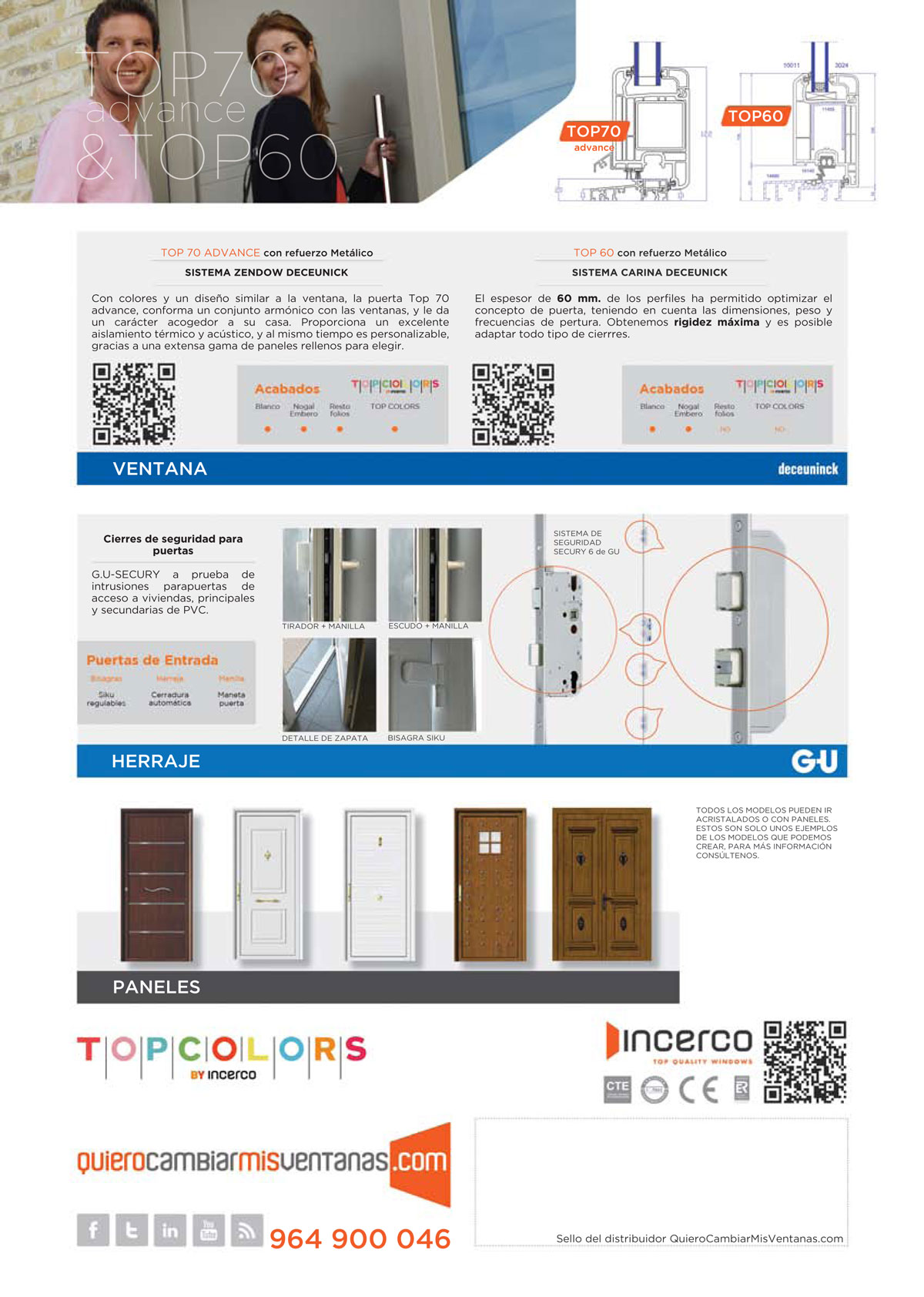 Con colores y un diseno similar a la ventana, la puerta Top 70 advance, conforma un conjunto armónico con las ventanas, y le da un carácter acogedor a su casa. Proporciona un excelente aislamiento térmico y acústico, y al mismo tiempo es personalizable, gracias a una extensa gama de paneles rellenos para elegir.